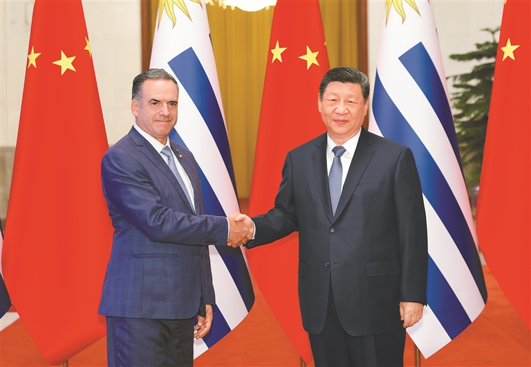 (下转第三版)(紧接第一版) 中方始终重视中拉关系,支持拉美和加勒比国家维护自身主权、安全、发展利益,支持乌拉圭接任拉美和加勒比国家共同体以及南方共同市场轮值主席国,愿同乌方和地区国家推动共建中拉命运共同体走深走实。