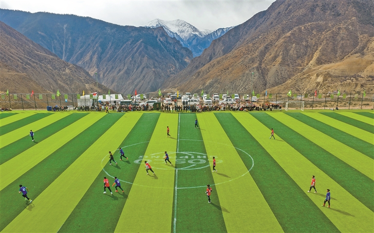 梦想终有回响。2024年,洛隆县与对口支援企业中国远洋海运集团一道在土球场附近,投资200余万元建成一座占地8000余平方米的11人制标准足球场,当年12月顺利竣工,被当地人亲切唤作“云上球场”。