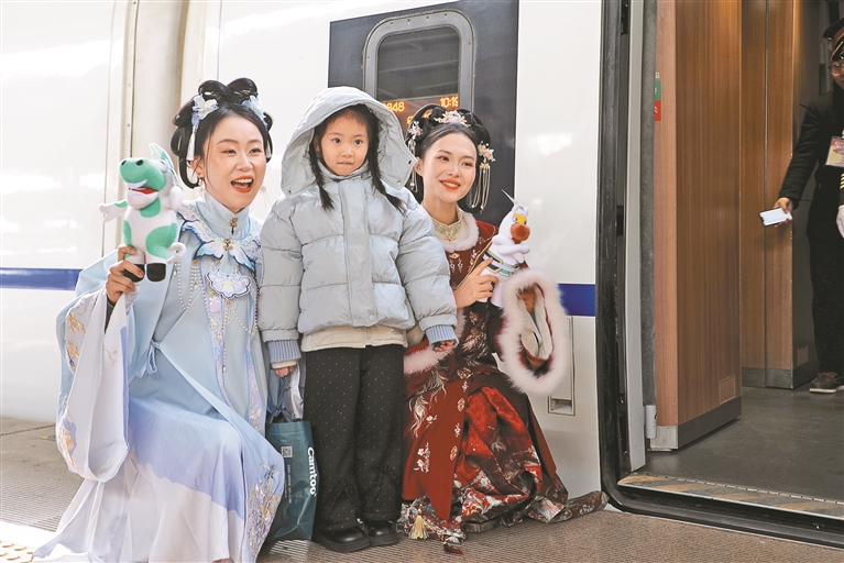 2月9日,由中国铁路兰州局集团有限公司、甘肃省文化和旅游厅、甘肃省文物局联合打造的“高铁流动博物馆”G848次列车从兰州西站发车,驶往广州南站。敦煌研究院、甘肃省博物馆等9家甘肃当地的国家一级博物馆,将陇原文脉“搬上”飞驰列车,让旅客在出行中触摸历史的温度,让传统年俗在春运车厢里焕发新彩。