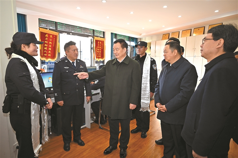 “双节”将至,全区政法干警强化值班备勤,全力守护万家灯火。来到城关区两岛派出所、明珠便民警务站,王君正与公安民辅警一一握手,详细了解基层派出所信息化平台运行情况和值班备勤安排。他说,基层一线的同志们始终坚守岗位、勇担使命,舍小家、顾大家,充分展现了广大政法干警的良好形象。提前祝大家新年幸福安康、生活美满。王君正强调,越是节日期间,越要发扬优良作风,压实工作责任,加强值班值守和工作调度,提高出警速度和质效,强化社会治安巡逻防控,恪尽职守、努力工作,全力保障春节、藏历新年期间社会和谐安宁。要强化科技赋能,优化硬件设施,提升警务工作数字化水平,助推民生服务便捷化、社会治理精准化。
