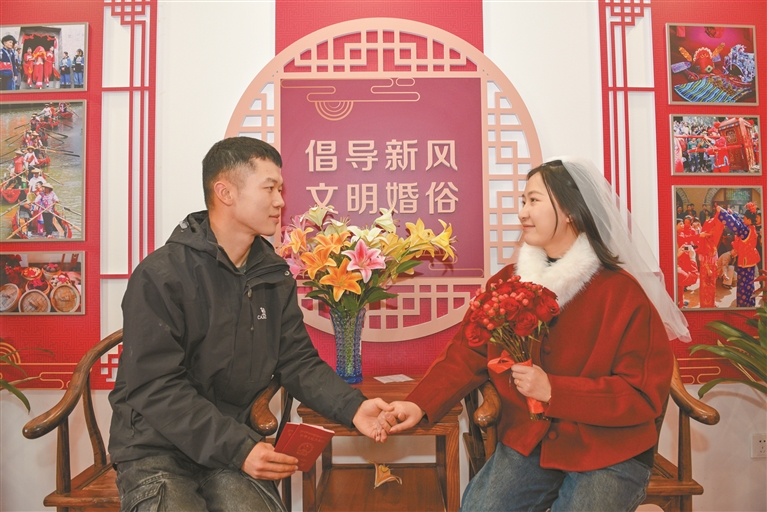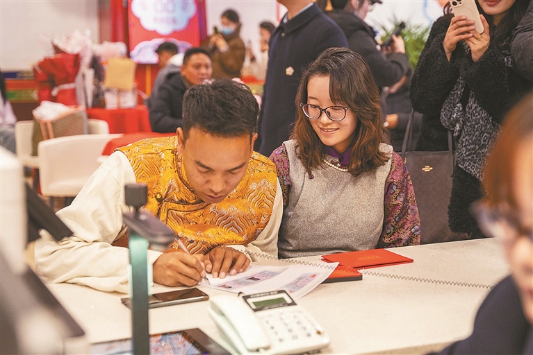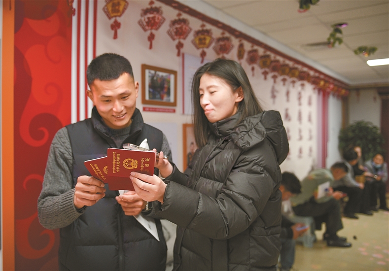 图为新人拍摄结婚证分享喜悦。本报记者 潘多 摄