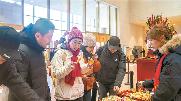 图为游客在西藏博物馆品尝藏族特色美食“卡塞”。本报记者 欧珠次仁 摄