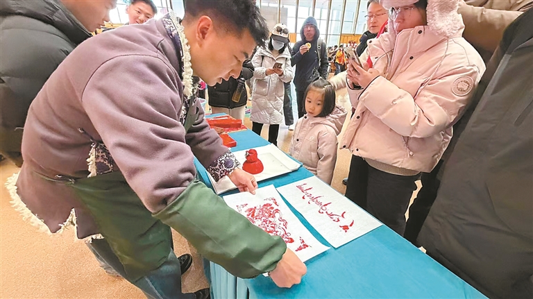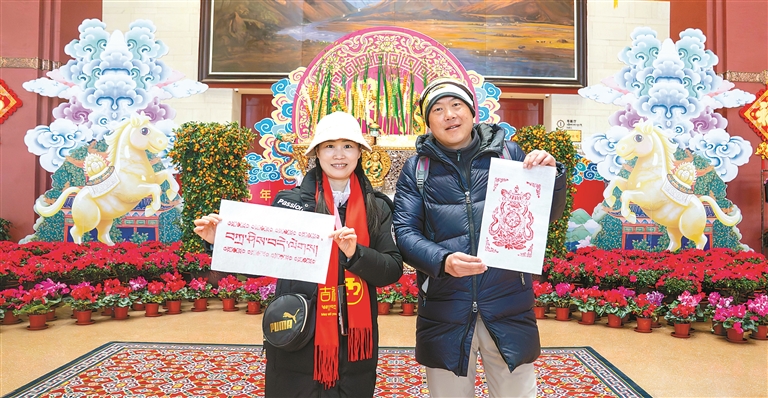 一旁的木刻印刷非遗体验区同样吸引了众多市民游客。在专业指导下,大家亲手印制“扎西德勒”“吉祥八宝”等吉祥图案,近距离感受传统文化的独特魅力,并将亲手制作的新年祝福带回家。