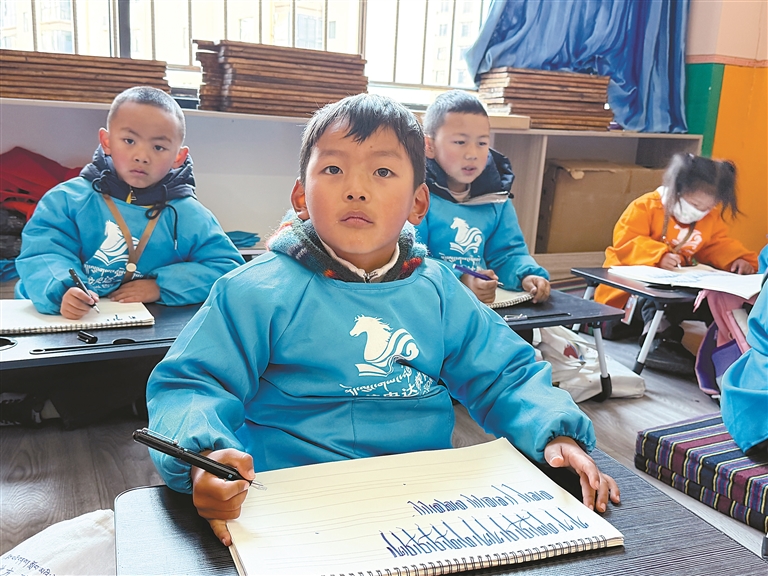 图为央达教育公益托管课堂上,孩子们练习藏文书法。本报记者 拉巴桑姆 摄