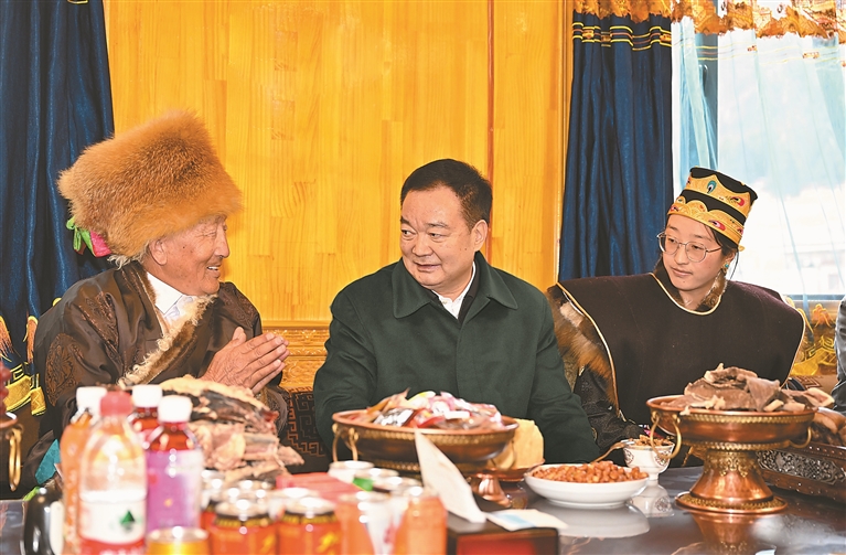 中华民族传统节日春节刚过,雪域高原又迎来了藏历新年初二,家家户户回荡着“罗萨扎西德勒”的温馨祝福。“过年了,祝你们新年快乐、身体健康、吉祥如意!”王君正走进鲁朗镇扎西岗村77岁的老党员、致富带头人平措家里,崭新的香布、整洁的小院,切玛斑斓、卡塞飘香,家里充满浓浓的年味儿。“身体怎么样?”“民宿生意好不好?”在暖意融融的客厅里,王君正和老人聊家常,询问身体状况及家庭收入等情况,随后走进平措家的民宿旅馆,从价格、住宿条件到屋外山景,看得仔细、问得深入。了解到在以习近平同志为核心的党中央亲切关怀下,扎西岗村发生了翻天覆地的变化,平措一家借助本地旅游资源,开民宿、做餐饮,年收入不断增加,日子越过越好,王君正为他们的发展感到由衷高兴、为他们的幸福生活点赞。他说,“看着北斗星走不迷路、跟着共产党走会幸福”,这些好日子,离不开以习近平同志为核心的党中央对西藏工作的高度重视、对西藏各族人民的深切关怀,大家要感恩总书记、感谢党中央,更加坚定不移听党话、感党恩、跟党走;党员要发挥先锋模范作用,发扬党的光荣传统和优良作风,带领村民用勤劳的双手把家园建设得更加美好,把日子过得更加甜蜜。