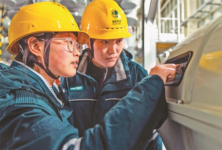 图②:藏中联网工程500千伏许木变电站工作人员检查断路器储能装置。