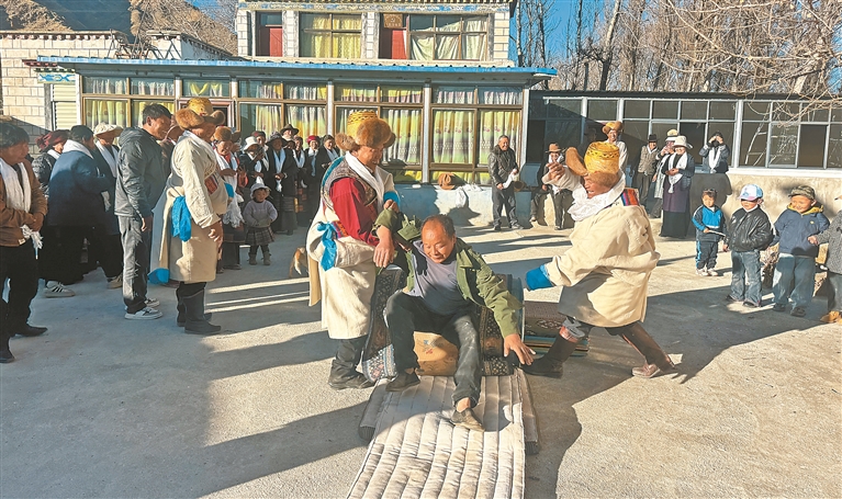 图为墨竹工卡县当天举办元宵节敬老主题活动。这是老人们在参加趣味游戏。本报记者 格桑伦珠 摄