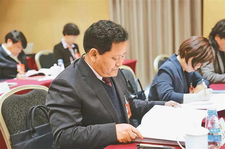 3月7日,全国政协委员扎西顿珠参加所在界别小组讨论。本报记者 陶玥 摄