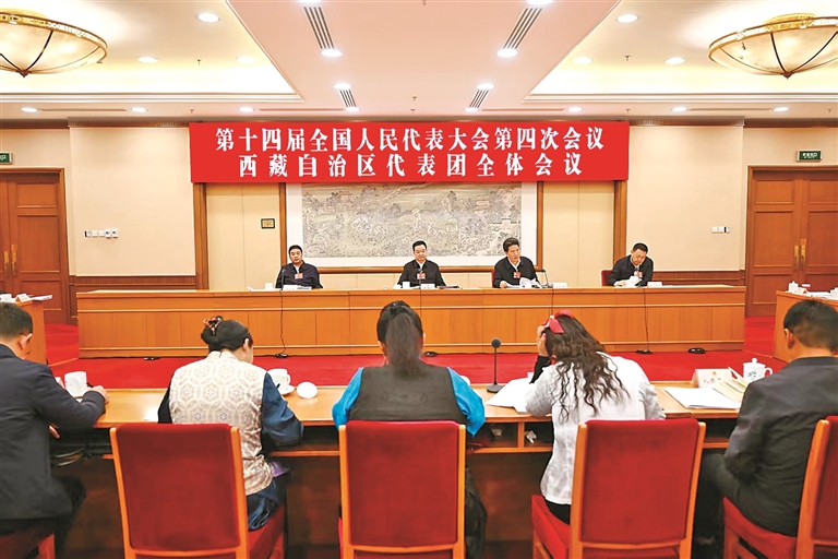 3月8日,西藏代表团举行全体会议,审议生态环境法典草案、民族团结进步促进法草案、国家发展规划法草案。这是会议现场。本报记者 李洲 摄