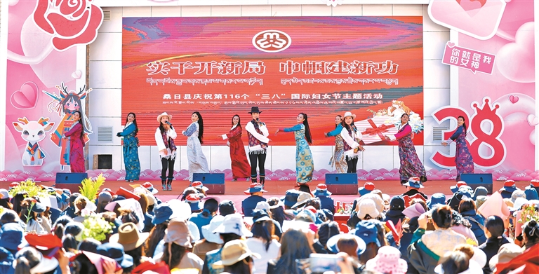 图①:3月7日,山南市桑日县以“实干开新局 巾帼建新功”为主题,开展“三八”国际妇女节主题活动。这是文艺汇演现场。