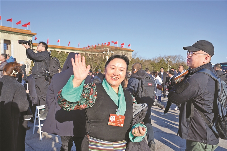 图为住藏全国政协委员巴桑卓玛向记者挥手致意。本报记者 陶玥 摄