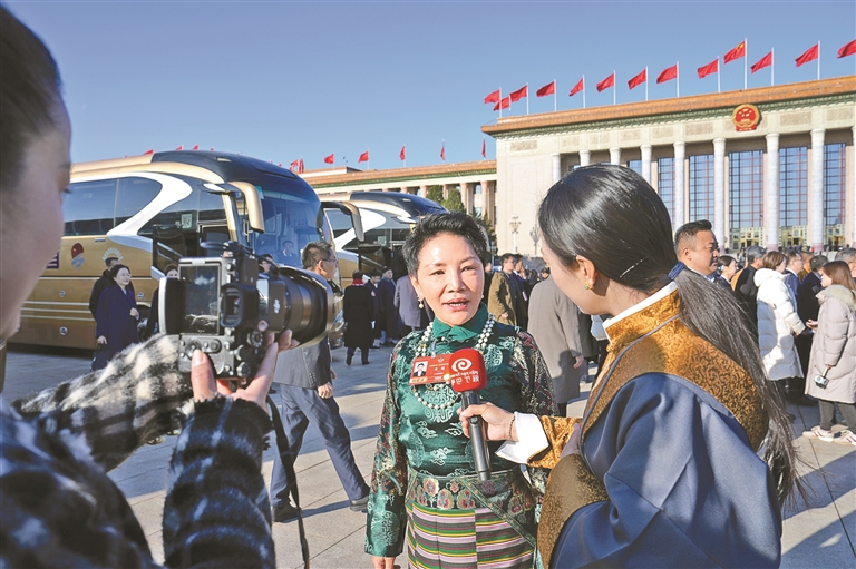 图为3月7日,全国政协十四届四次会议第二场“委员通道”集体采访活动在人民大会堂举行。这是住藏全国政协委员明吉措姆接受媒体采访。本报记者 旦增旺姆 摄