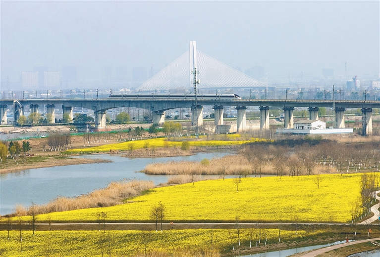 图为2026年3月11日,一列高铁列车穿行在安徽省合肥市肥东县十八联圩生态湿地(无人机照片)。新华社记者 杜宇 摄