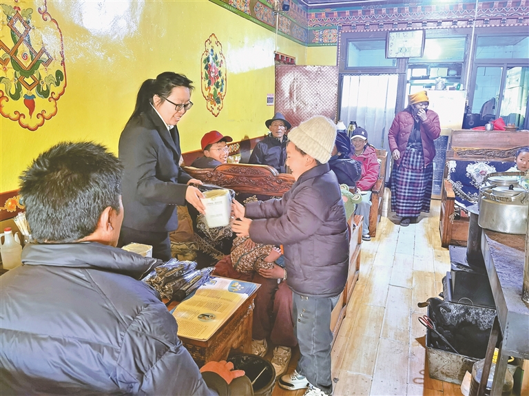 图为林周县人民法院干警走进松盘乡甜茶馆,开展普法活动。本报记者 央金 摄