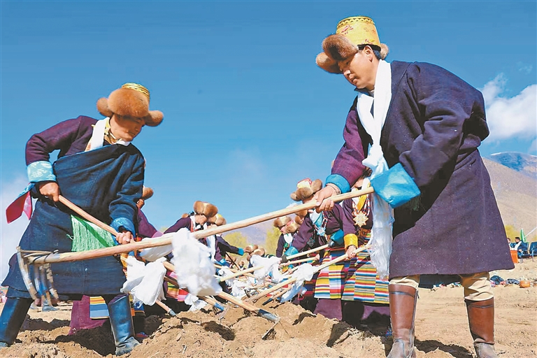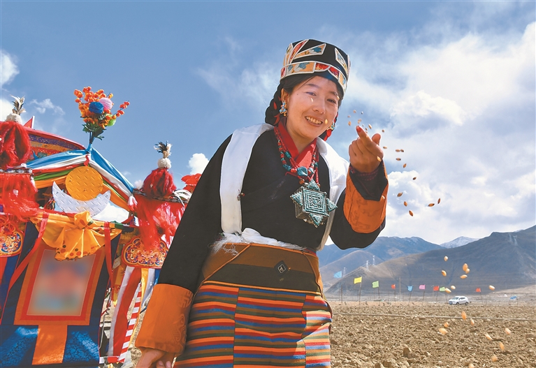 (下转第二版)(紧接第一版) 随着嘹亮的“扎西德勒”祝福声响起,村民们向天空抛撒糌粑,祈愿风调雨顺。