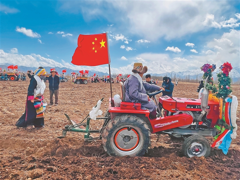 开耕仪式上,村民身着节日盛装,聚在田间地头,拖拉机等农机设备擦拭一新,机头鲜艳的五星红旗迎风招展。大家捧出切玛盒,一字排开,互献哈达、互敬青稞酒、同唱祝福歌,每个人脸上都洋溢着对丰收年景的期盼。