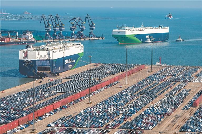 图为2026年1月27日,在山东港口烟台港,汽车运输船在装载出口商品车(无人机照片)。新华社发(张超 摄)