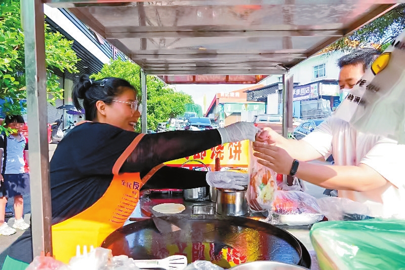 摊主名叫杜可,一年前开始做起烧饼生意。因为爸爸妈妈都在外地打工,杜可从小和哥哥一起长大。“一次家里没米了,要到村里的小卖部打电话给父母才能寄钱回家。但因为没有钱打电话,那段时间我和哥哥每天都煮土豆吃。隔壁邻居发现后,给我俩送来10斤米和一碗猪油。这件事让我温暖至今。”杜可说,虽说她卖的饼不值多少钱,但希望以微薄之力,帮助到那些有困难的人。