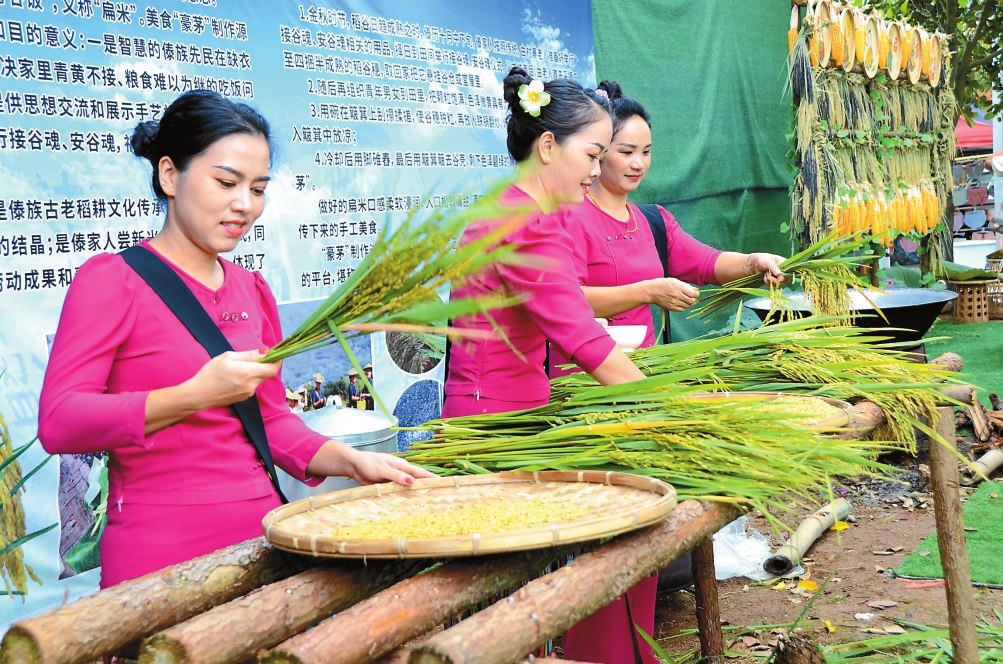 “豪茅”为傣语,汉语译作“青谷饭”,又称“扁米”。在盈江县,舂“豪茅”已有多年历史,是傣族同胞相互邀约,共同庆祝丰收而开展的一项美食制作活动。此次“豪茅”旅游节的举办,旨在传承傣族稻耕文化,以文塑旅、以旅彰文,激活乡村文旅融合发展“新引擎”,持续深入推进民族团结,全面推进乡村振兴。