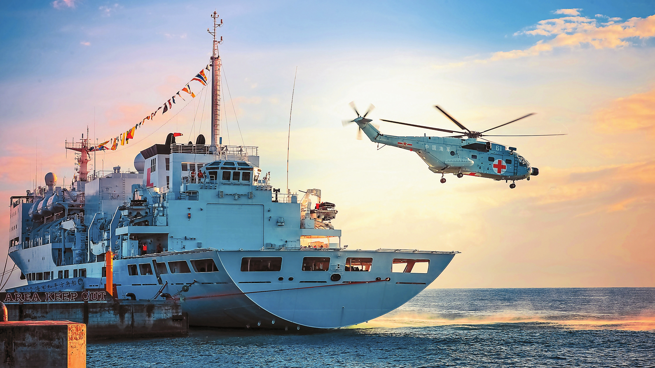 当地时间8月26日中午,中国海军“和平方舟”号医院船结束对所罗门群岛的首次访问,按计划前往“和谐使命-2023”任务最后一站东帝汶。访问所罗门群岛期间,“和平方舟”号医院船为当地民众、华侨华人等提供免费医疗服务,还派出多支医疗分队在当地进行医疗服务、学术交流等,共诊疗患者超过万人次。图为8月24日,中国海军“和平方舟”号医院船靠泊所罗门群岛霍尼亚拉港期间,舰载医疗救护直升机赴外岛开展巡诊服务。 新华社发 黎宇 摄