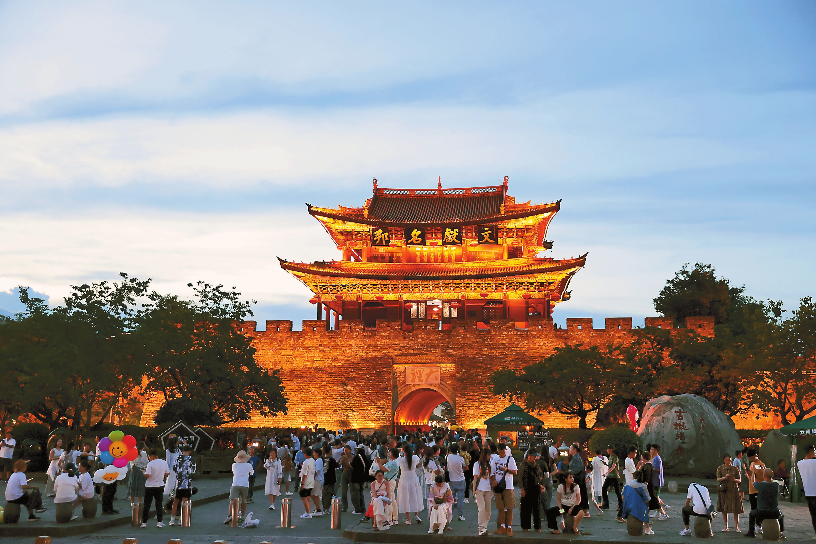 大理白族自治州持续提升旅游品质,不断丰富文旅新产品、新业态,“旅游+”“+旅游”等旅游产品遍地开花,旅游业焕发勃勃生机,整个暑期保持游客高流量状态。图为流光溢彩的大理古城南门吸引大量游客。本报记者 陈飞 摄