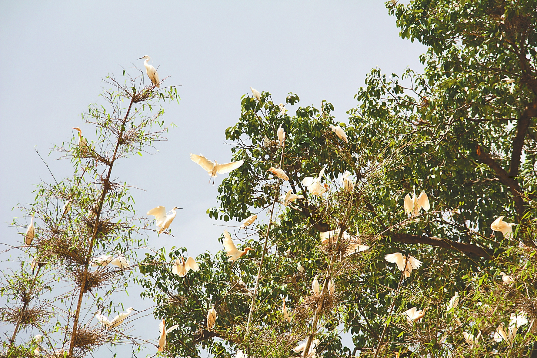 这参天古榕,为数万只雪白飞鹭提供了安身之所,形成了“鹭鸶天堂”的奇景。年长的村民说,从小长辈就告诉他们,要保护好鹭鸶,不能伤害它们,它们是人类的朋友。白鹭与当地的农民一起,日出而作,日落而息,与农为友,栖息古榕。在农田里,你可以看到村民在干活,白鹭在村民旁拣食昆虫的场景,正所谓“远看繁花似锦,近看百鸟朝春”,形成了一幅人与白鹭和谐共处的优美画卷。