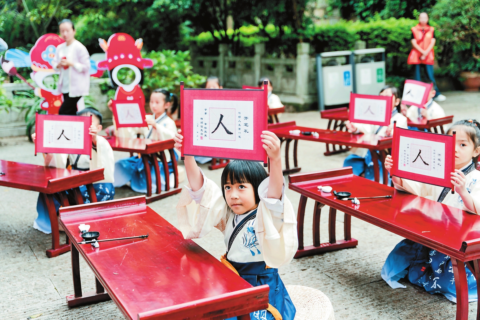 活动上,小学生们在老师的带领下步入升庵祠,穿过启智门,先后开展正衣冠、点朱砂、习礼仪等传统开笔仪式,最后以诵读《三字经》结束活动。