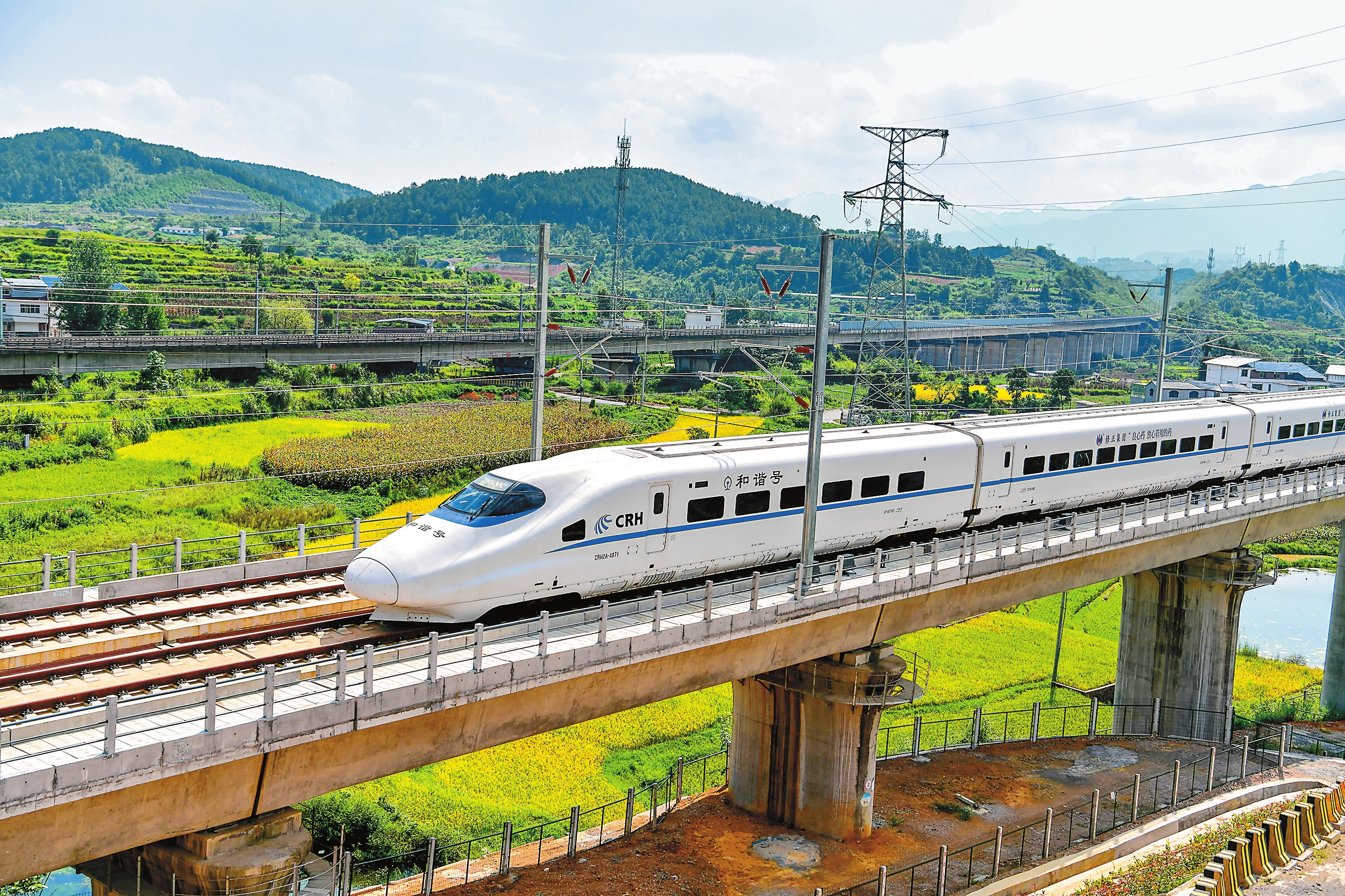 继新建贵阳至南宁高速铁路贵阳至荔波段8月8日开通运营后,南宁至荔波段于8月31日开通运营。至此,贵南高铁实现全线贯通运营,我国西南和华南地区新增一条交通大动脉,黔桂两地间交通出行更加便捷、西南与华南地区联系将更加紧密。图为8月31日,一列动车组列车经过位于贵州省都匀市境内的贵南高铁营盘清水河双线特大桥。
