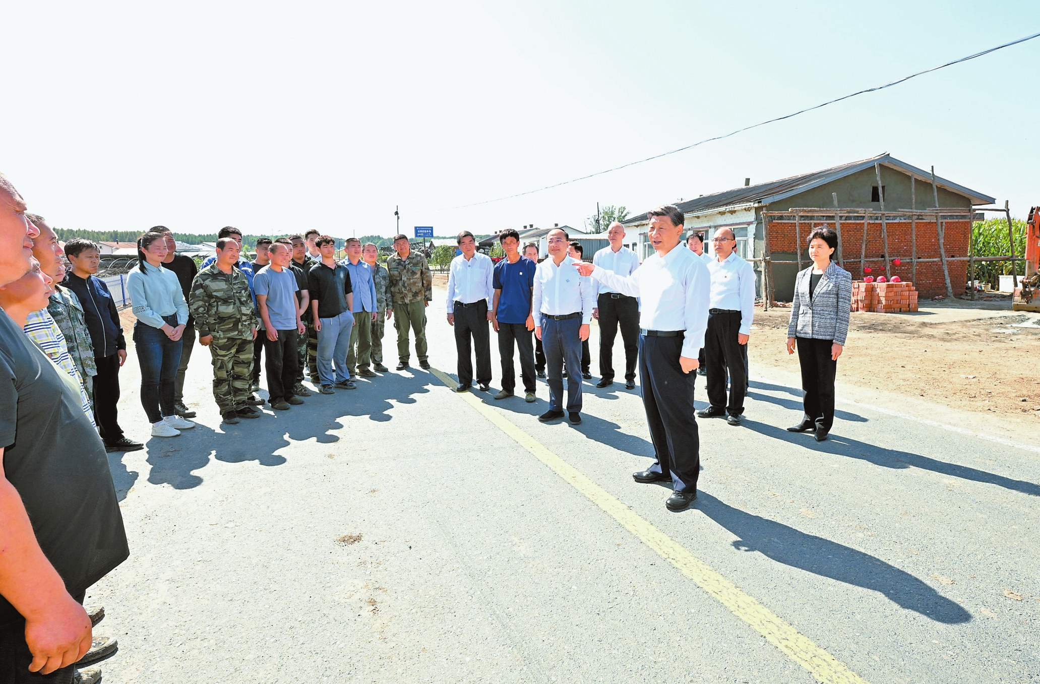 9月6日至8日,中共中央总书记、国家主席、中央军委主席习近平在黑龙江考察。这是7日上午,习近平在遭受洪涝灾害的哈尔滨尚志市老街基乡龙王庙村,同当地村民和施工人员亲切交流。新华社记者 谢环驰 摄