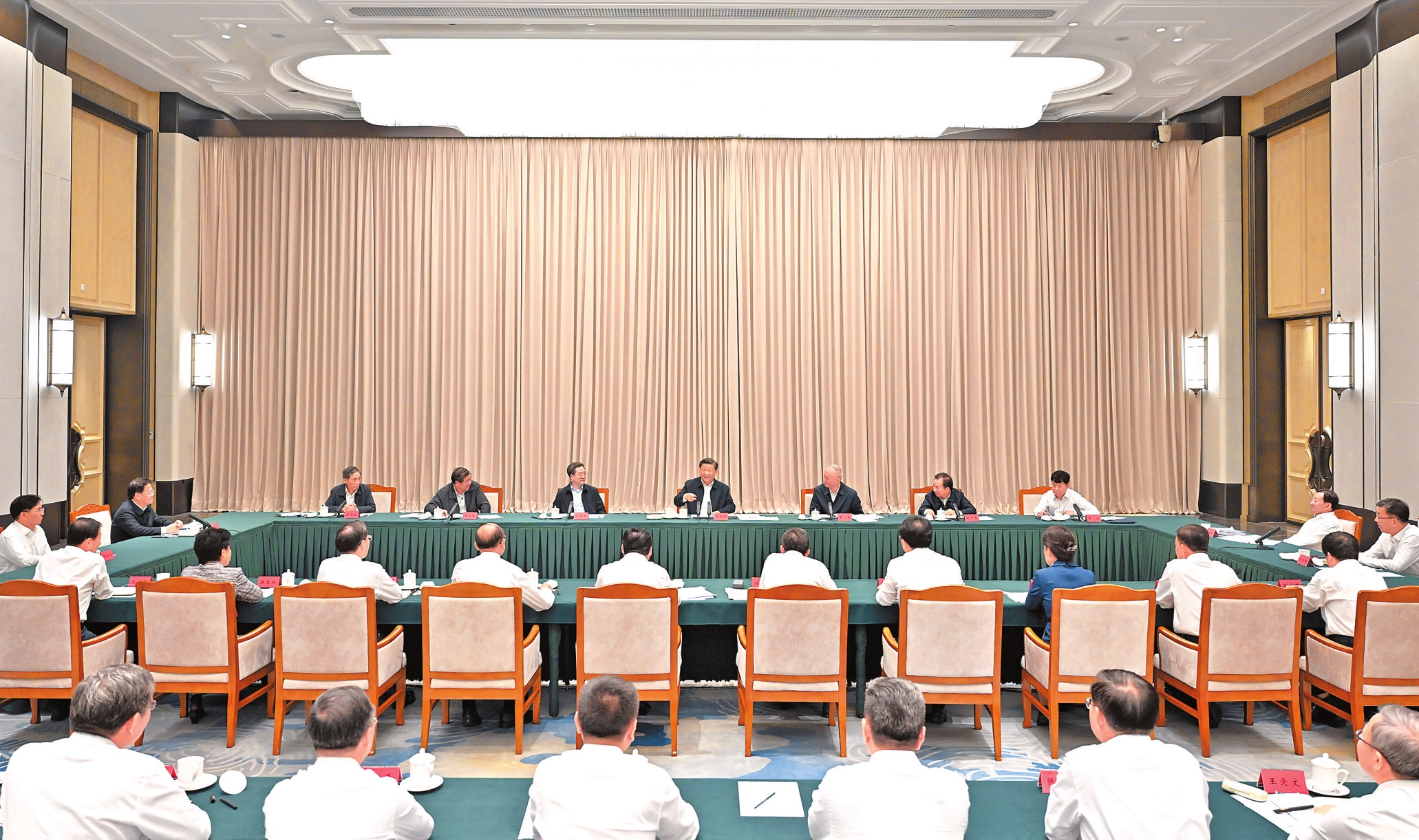中共中央政治局常委、中央办公厅主任蔡奇,中共中央政治局常委、国务院副总理丁薛祥出席座谈会。