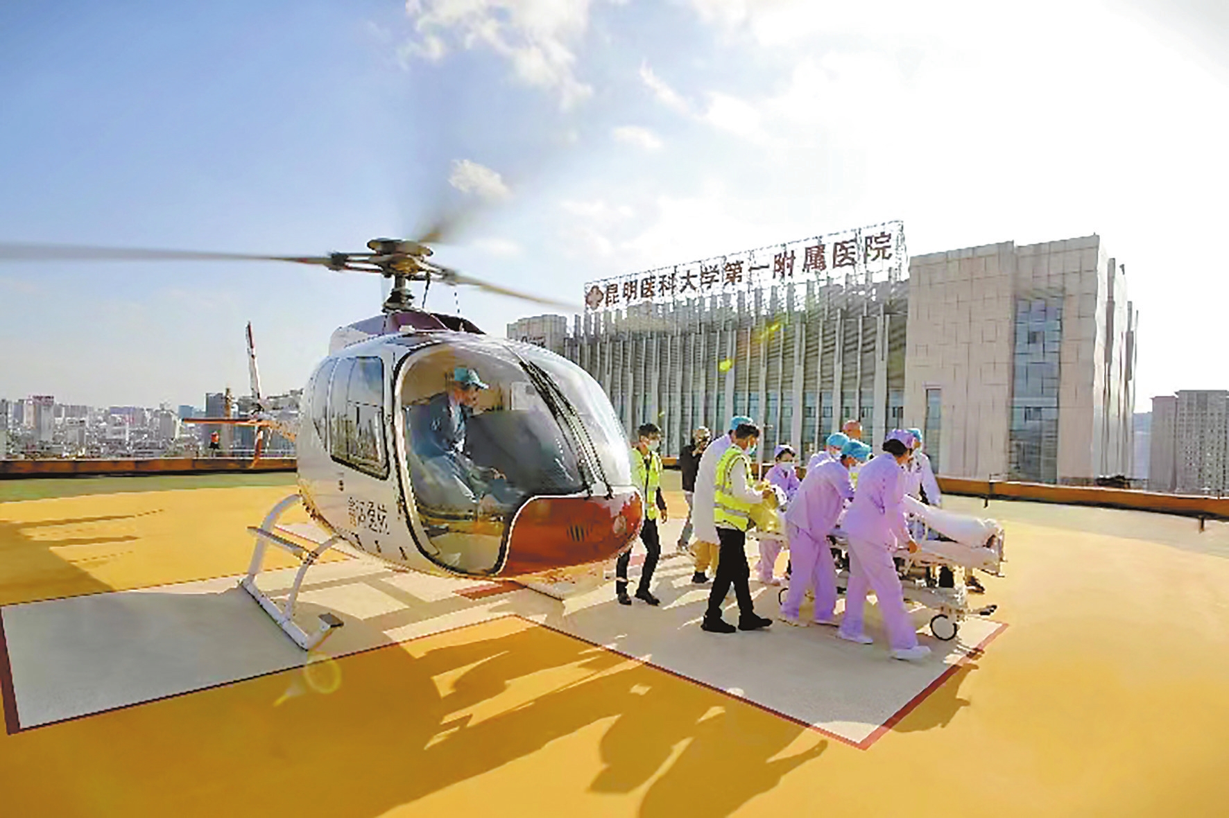 昆医大附一院医务部主任张玮介绍,2013年,云南省航空医学救援昆明医科大学第一附属医院救援点成立,配备了专业救援团队,制定航空紧急救援应急预案。该医院西昌路和呈贡两个院区均建有大型直升机停机坪,具备2吨级救援直升机起降能力,可实施空中悬停索降救援,救援直升机航程覆盖西南地区及周边接壤国家,目前已成功转运多起全省危重症患者及高速公路车祸伤员。