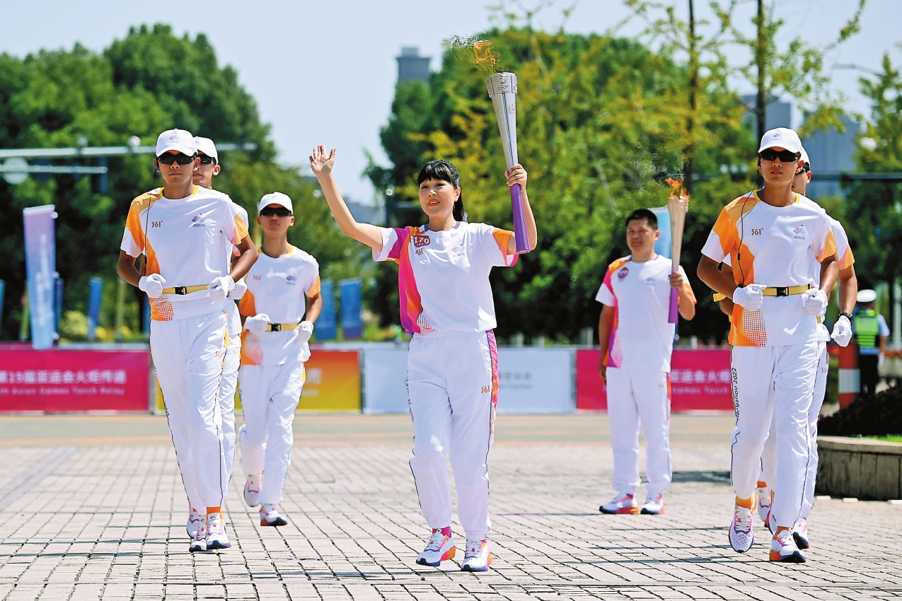 9月10日,杭州亚运会火炬在浙江省嘉兴传递。图为当日,火炬手张晓萍在火炬传递中。 新华社记者 徐昱 摄