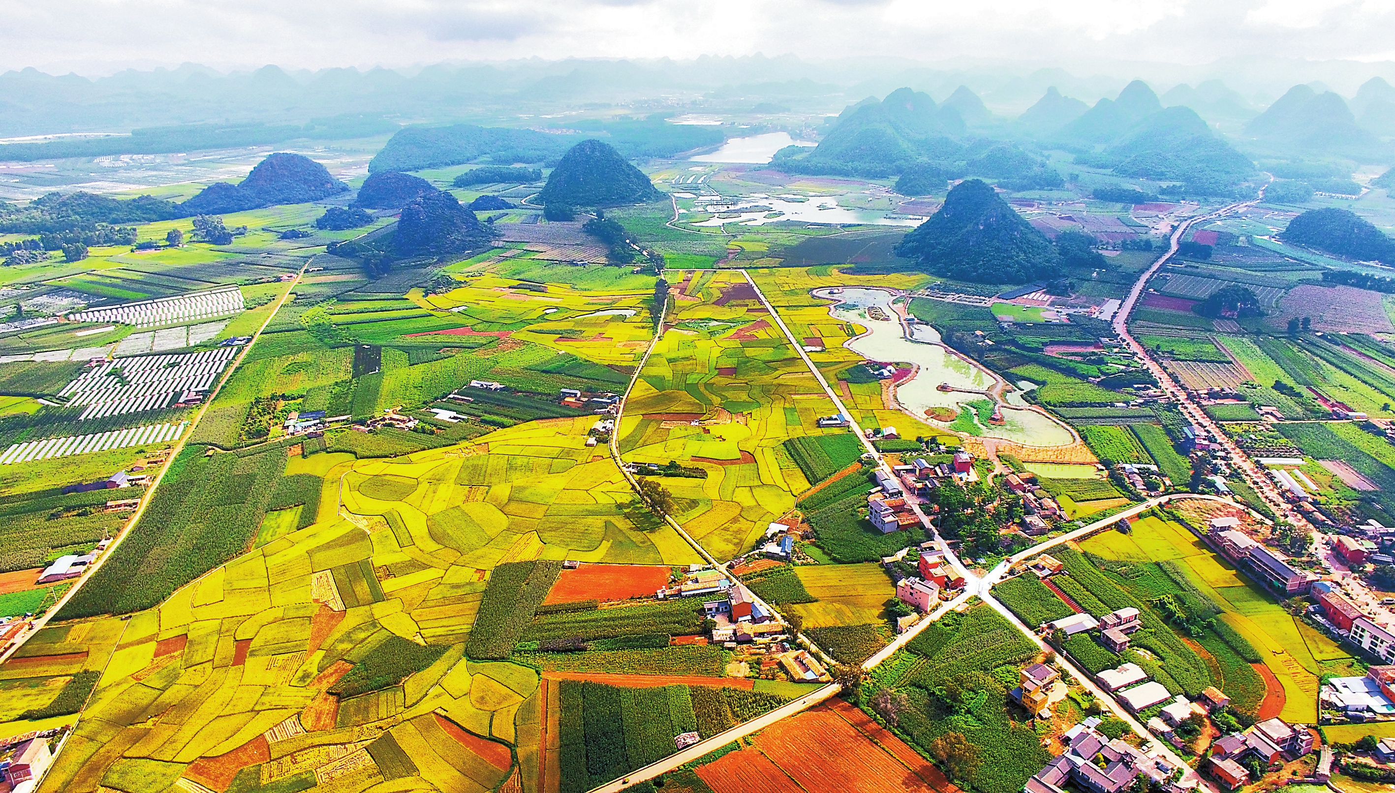 金秋时节,丘北县10.67万亩水稻进入收获期。图为丘北县八道哨乡万亩稻谷种植基地航拍场景。