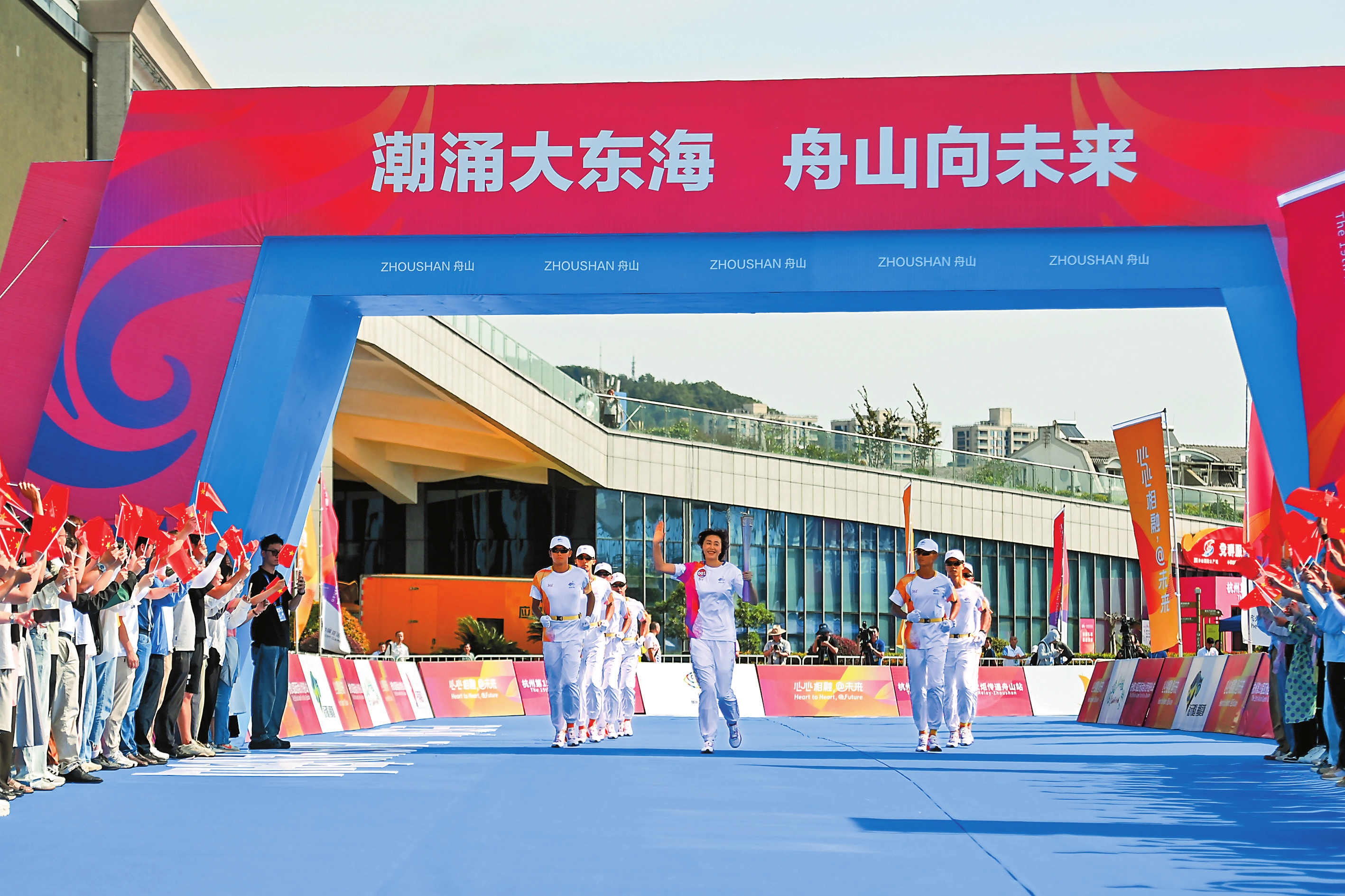 9月13日,杭州亚运会火炬在浙江省舟山传递。图为当日,火炬手罗瑜在火炬传递中。