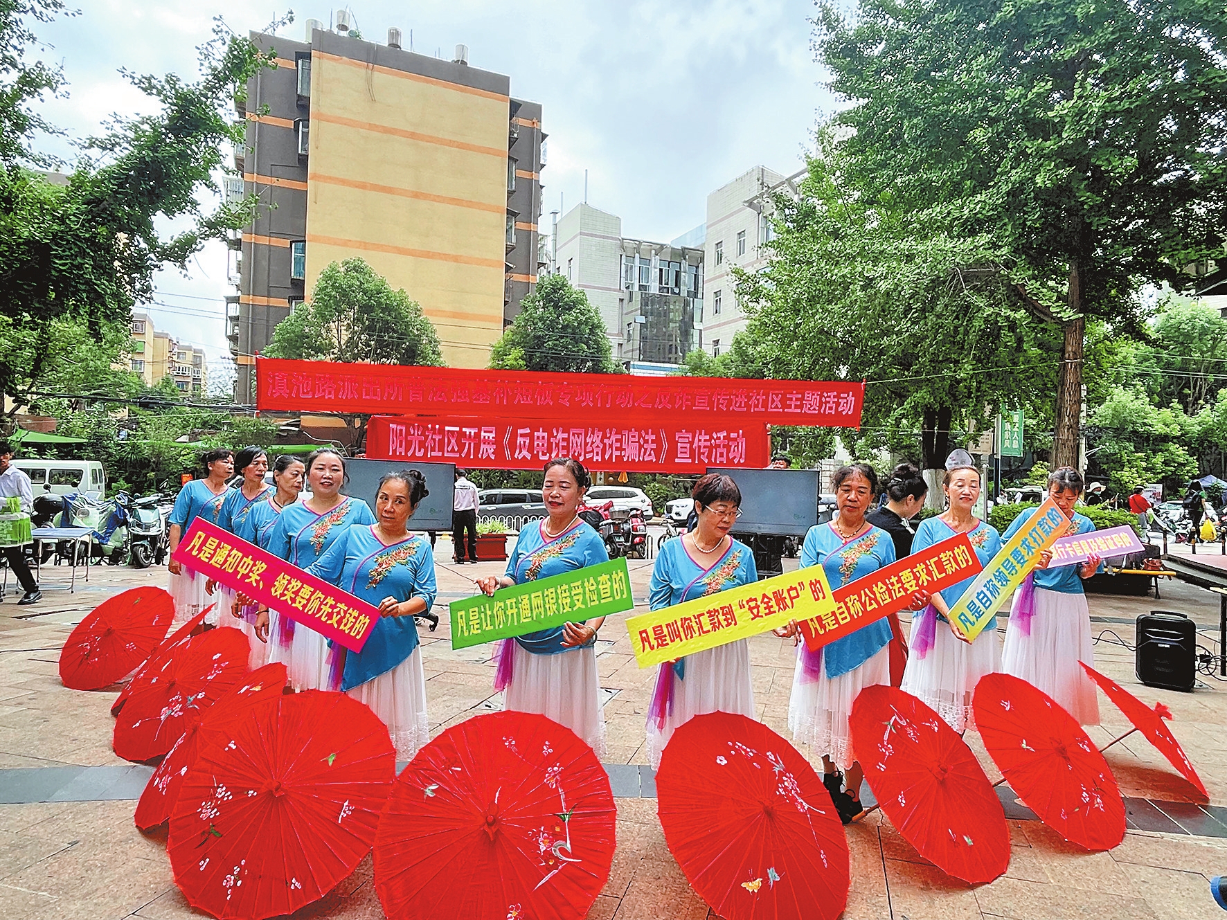 阳光社区文艺宣传小分队既是本次活动的受益者,也是服务者。“我们都是社区居民,年龄在60岁以上。把‘反电诈’知识编排进歌舞节目中,不仅自己学习了,也把知识传播给观众,收获满满的成就感。”小分队成员介绍。