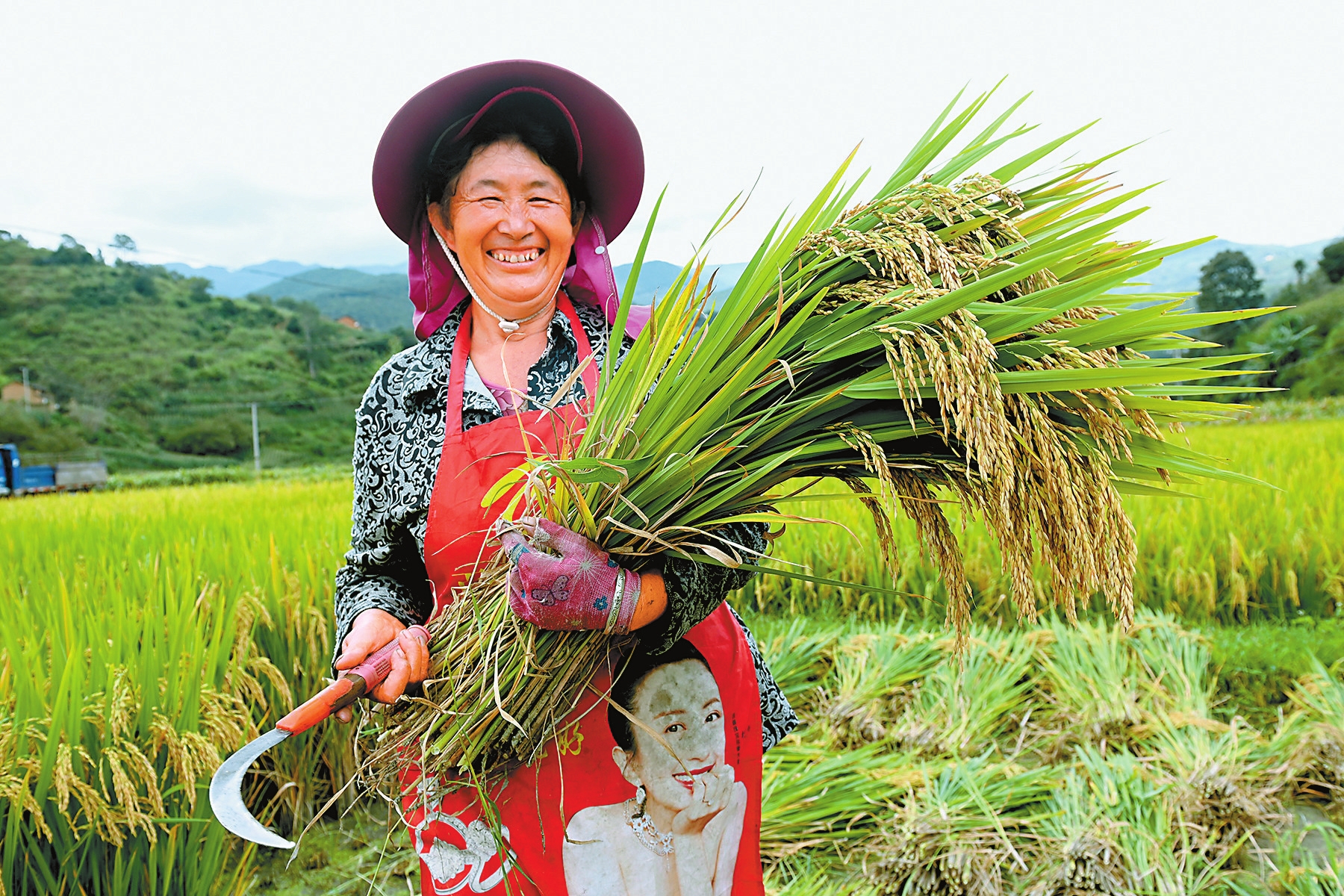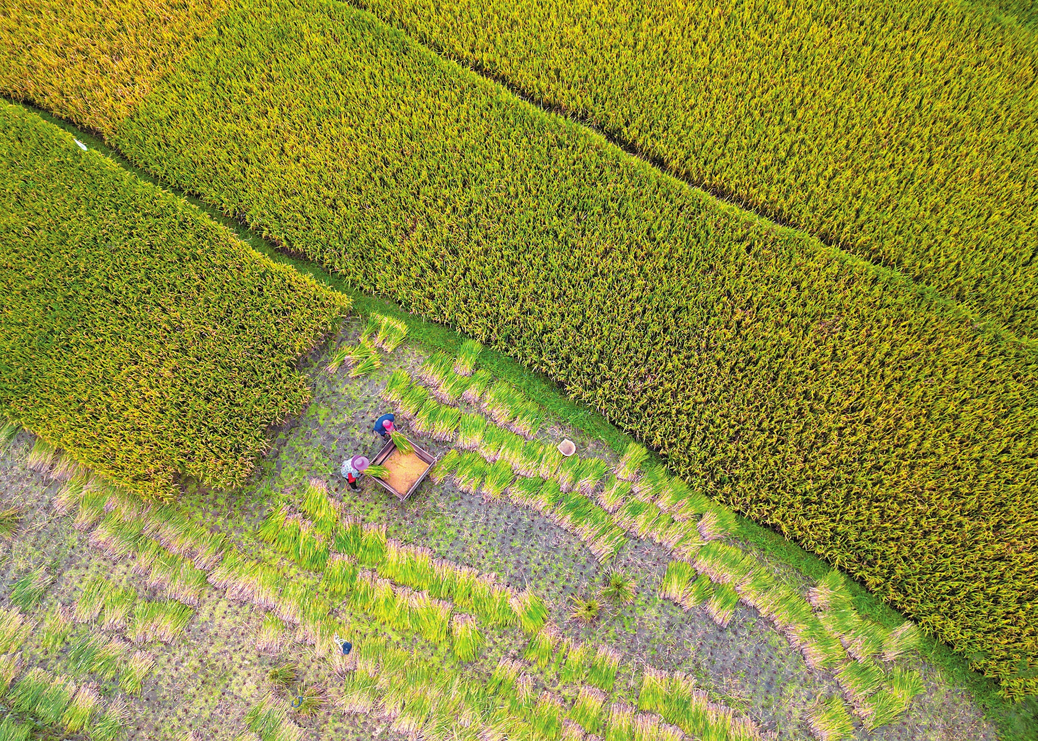 眼下,南涧彝族自治县水稻陆续进入收割期,田间地头一派繁忙的秋收景象。图为南涧县公郎镇凤岭村农户在稻田间抢收稻谷。
