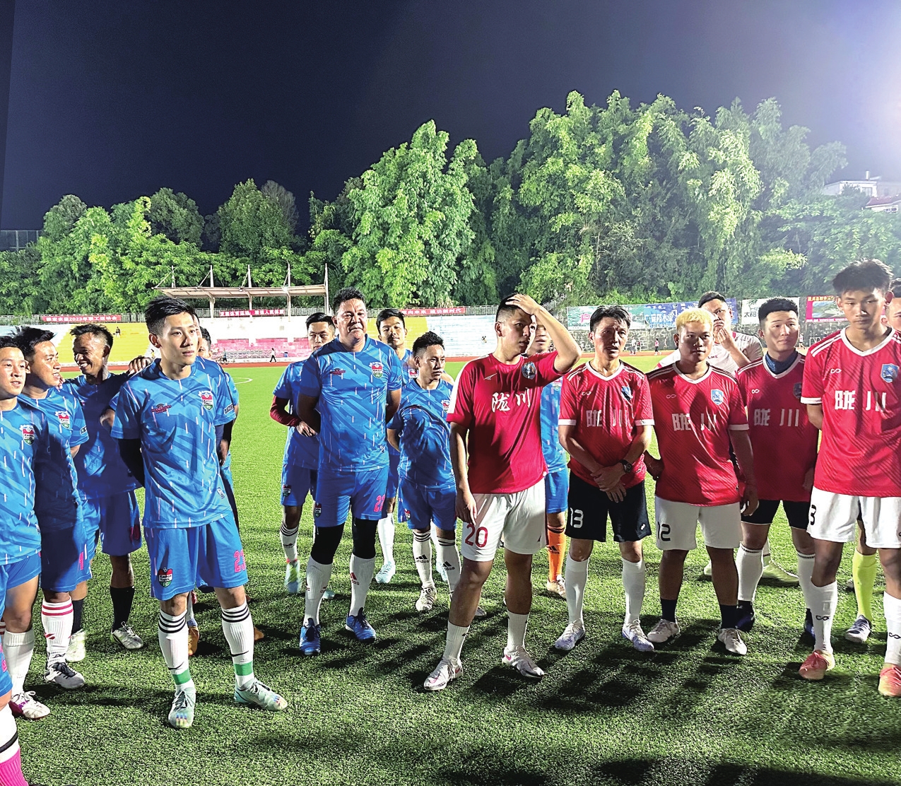 9月14日20时,“口岸·我们的‘一带一路’”网络国际传播项目采访团行至德宏傣族景颇族自治州陇川县体育运动中心,欢呼声和加油声扑面而来,陇川足协队与沿边缅籍明星联队的比赛在热火朝天地进行。球场周边,健步如飞的大爷在跑道上锻炼,稚步蹒跚的小孩在父亲的引导下带球玩耍,围观的群众用手机记录下一幕幕精彩瞬间……采访团成员无不被现场的气氛打动。