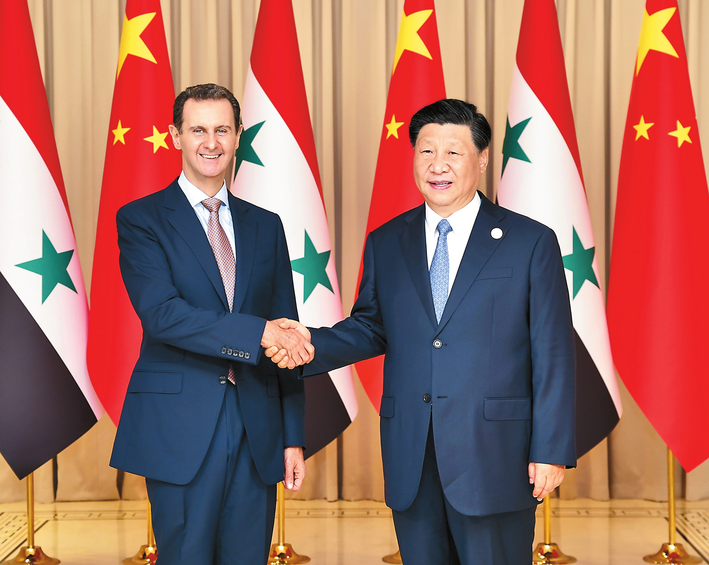 巴沙尔表示,中国通过自身奋斗,走出了一条成功的中国特色社会主义道路。中国在国际事务中始终站在国际公平正义一方,站在国际法和国际人道主义一方,发挥着重要建设性作用。习近平主席提出的共建“一带一路”倡议、全球发展倡议、全球安全倡议、全球文明倡议,目的都是通过合作帮助所有人实现安全和发展,共享和平繁荣的未来,叙方高度赞赏、坚定支持,并将积极参与。叙方衷心祝贺中国取得的伟大成就,感谢中国政府给予叙利亚人民的宝贵支持,坚决反对任何干涉中国内政的行为,愿做中国长期坚定的朋友和伙伴。叙方愿以建立叙中战略伙伴关系为契机,加强双边友好合作,密切在国际和地区事务中的沟通协调。