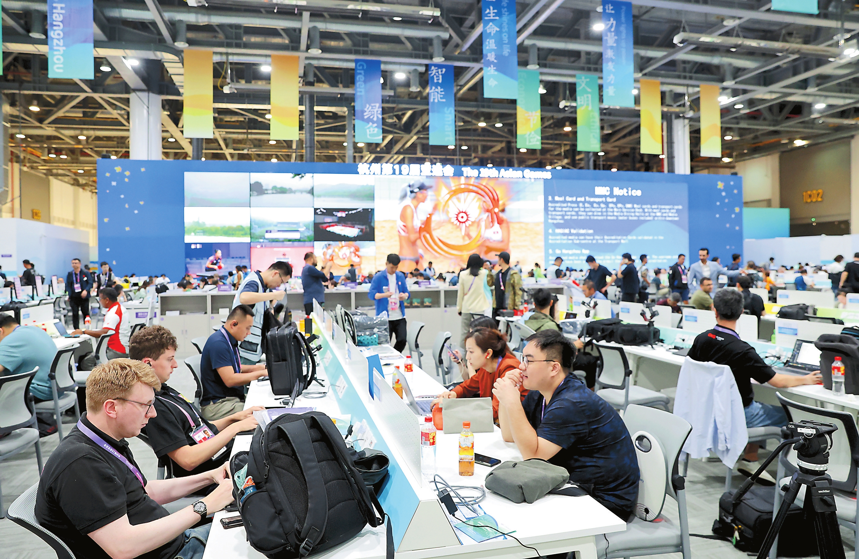 9月22日,各国记者在杭州亚运会主媒体中心开展工作,为即将开幕的杭州亚运会作准备。杭州亚运会主媒体中心包括主新闻中心、国际广播中心、生活服务中心等部分,赛会期间将24小时运行。本报特派记者 周灿 摄