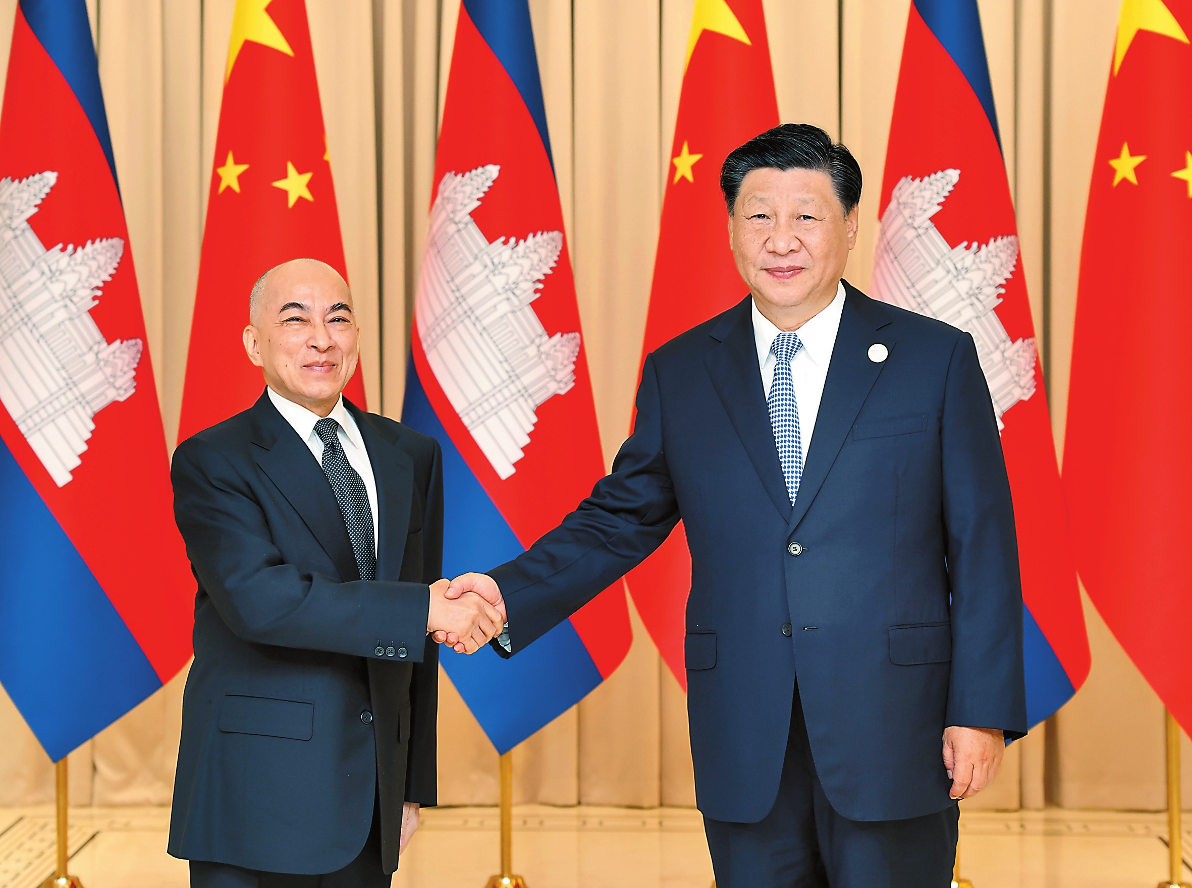 习近平指出,今年是中柬建交65周年和中柬友好年。我同西哈莫尼国王两次会面,体现了中柬亲如一家的深厚情谊。前不久,我在北京会见洪玛奈首相,就传承世代友好、深化全面战略合作达成重要共识。中方珍视同柬埔寨王室的特殊友谊,高度重视中柬关系发展,愿同柬方一道,推动中柬命运共同体建设走深走实。