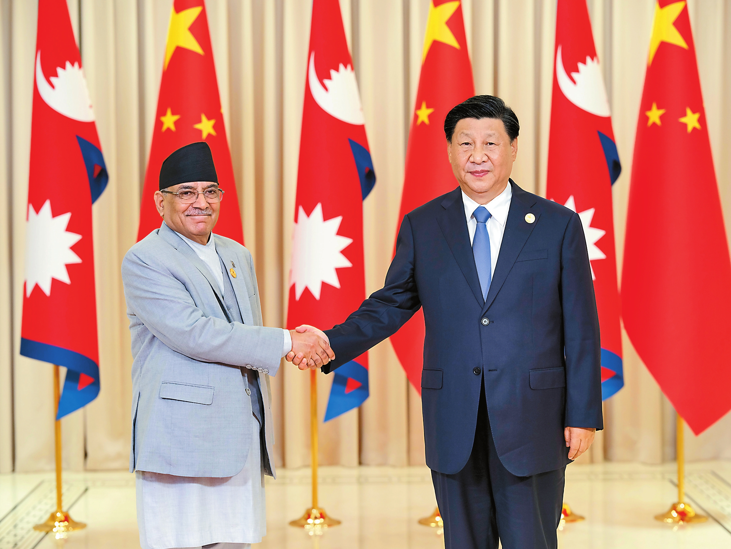 习近平指出,中国和尼泊尔山水相连、世代友好。建交68年来,两国坚持和平共处五项原则,树立了大小国家平等相待、合作双赢的典范。中尼在实现国家发展繁荣的道路上互为伙伴、互为机遇。中方高度重视中尼关系,愿同尼方加强发展战略对接,推动中尼关系不断取得新进展。