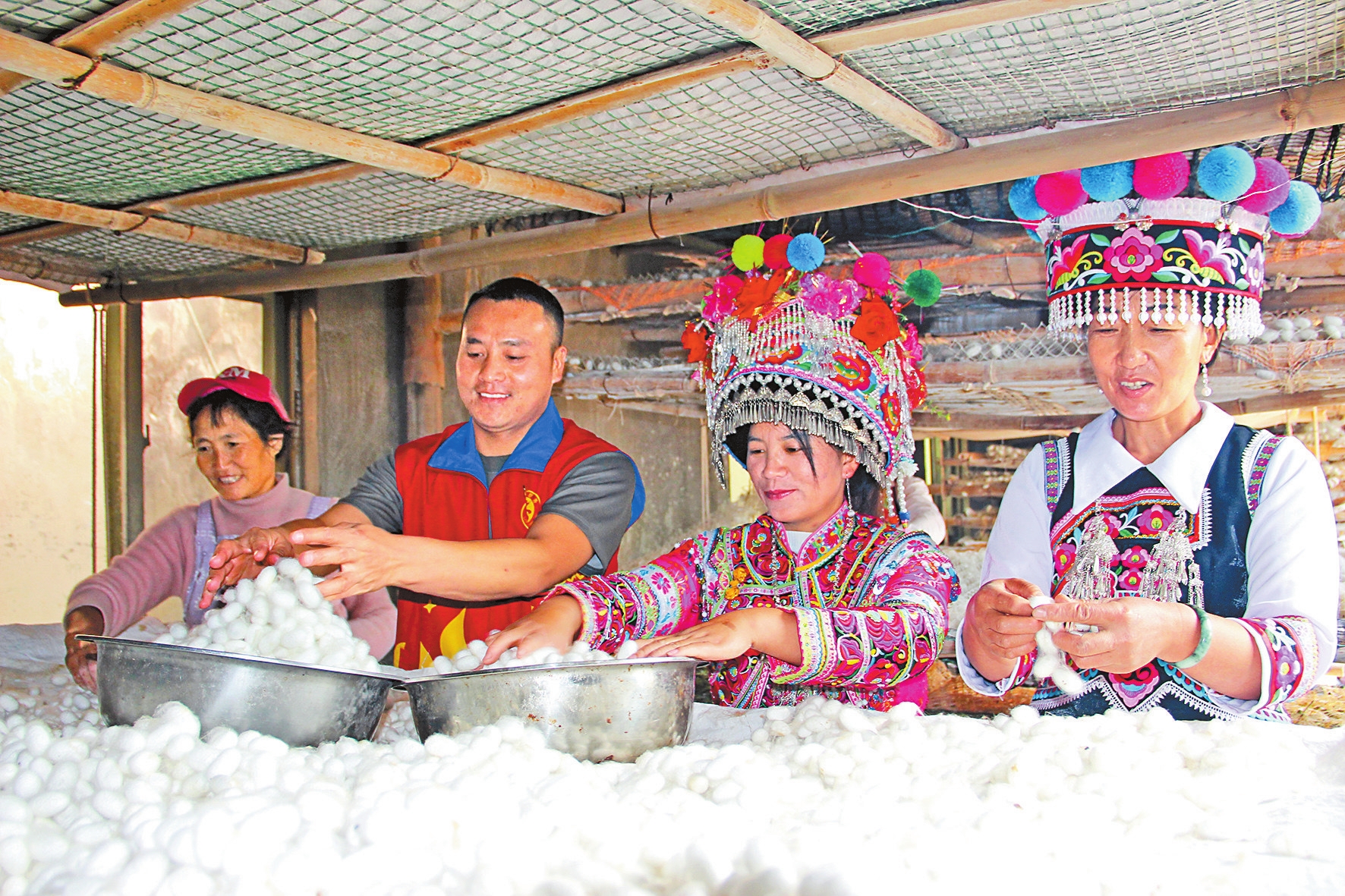 近年来,大姚县以“党组织+企业+合作社+农户”模式发展蚕桑产业,构建蚕桑全产业链体系,今年春夏两季,全县8496户蚕农售茧收入达7728.6万元。图为党员志愿者到石羊镇土枧槽村委会土枧槽小组帮助彝族群众收蚕茧。