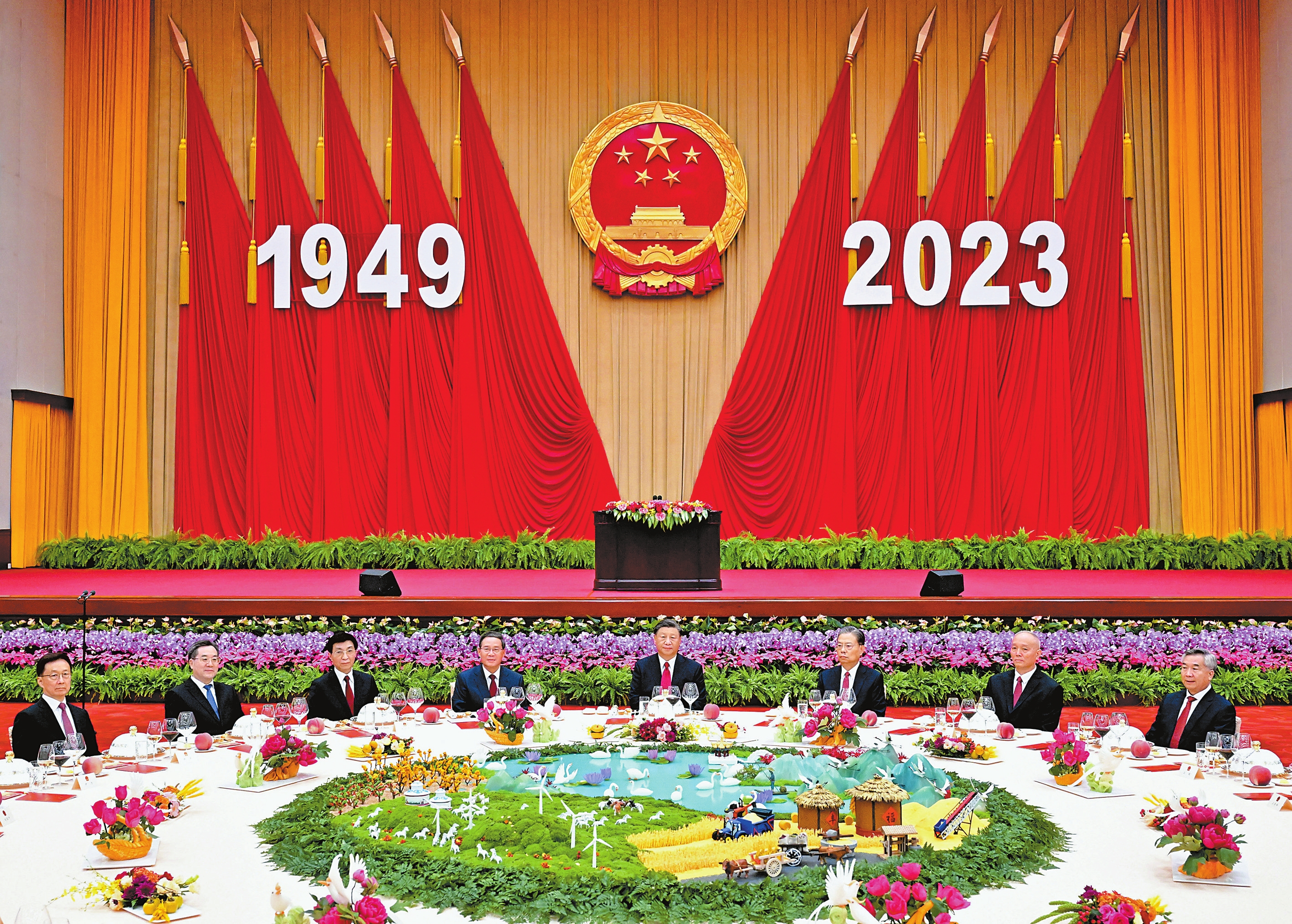 人民大会堂宴会厅华灯璀璨、鲜花绽放,洋溢着喜庆热烈的节日氛围。主席台上方高悬着庄严的国徽,“1949-2023”大字年号在鲜艳的红旗映衬下格外醒目。