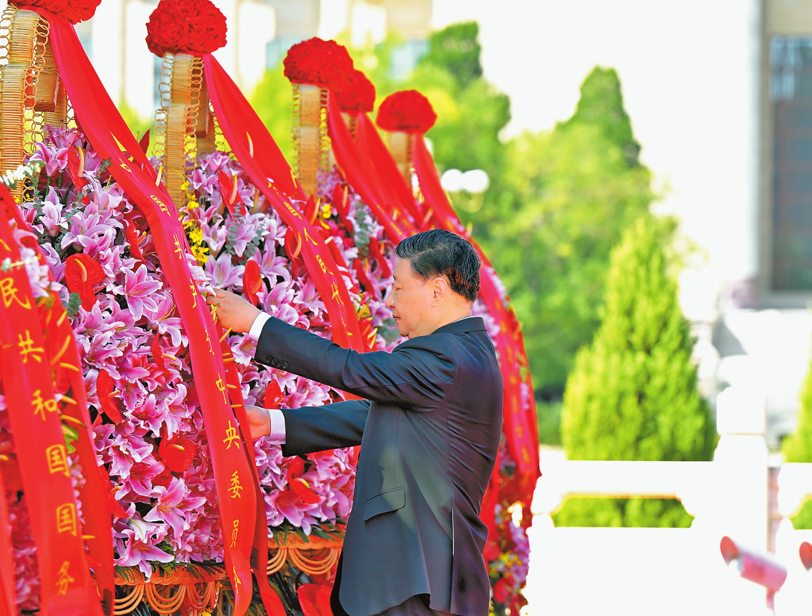 9月30日上午,党和国家领导人习近平、李强、赵乐际、王沪宁、蔡奇、丁薛祥、李希、韩正等来到北京天安门广场,出席烈士纪念日向人民英雄敬献花篮仪式。这是习近平整理花篮上的缎带。新华社记者 殷博古 摄