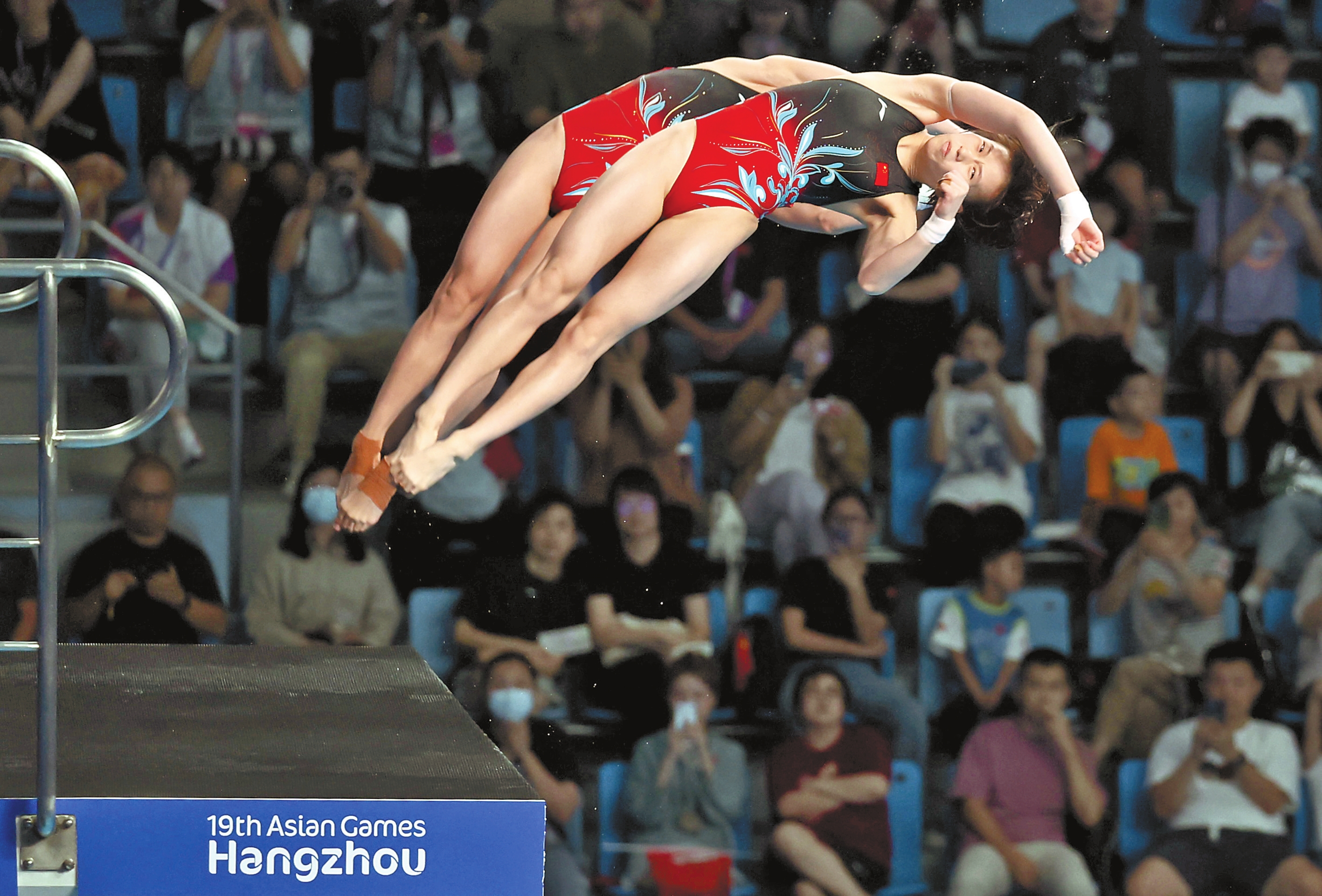 9月30日,中国组合全红婵/陈芋汐不负众望,再次上演“水花消失术”,以总分375.3分的巨大优势拿下金牌,取得了跳水项目的开门红。从第一轮起,全红婵/陈芋汐就确立了领先优势。5轮动作,两人完成得干净利落,裁判不停打出9.5、10分的超高分。最终两人以超出第二名85分的成绩夺冠,帮助中国队实现了亚运会女子双人10米跳台的六连冠。本报特派记者 娄莹/文 周灿/图 杭州专电