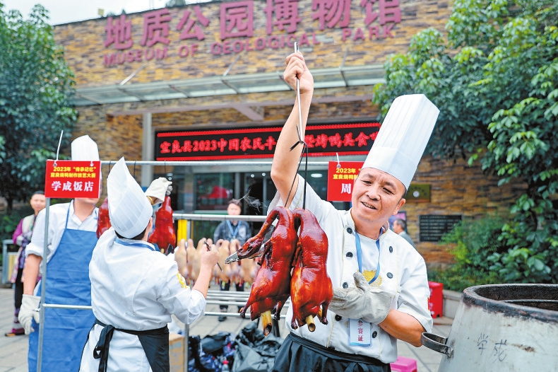 9月28日,宜良县2023中国农民丰收节暨烤鸭美食节在九乡风景区前区广场开幕。在“传承非遗”烧鸭制作技艺大赛活动中,宜良县的50名烤鸭大师现场竞技烧制烤鸭,让前来参加美食节的市民游客们大饱眼福和口福。