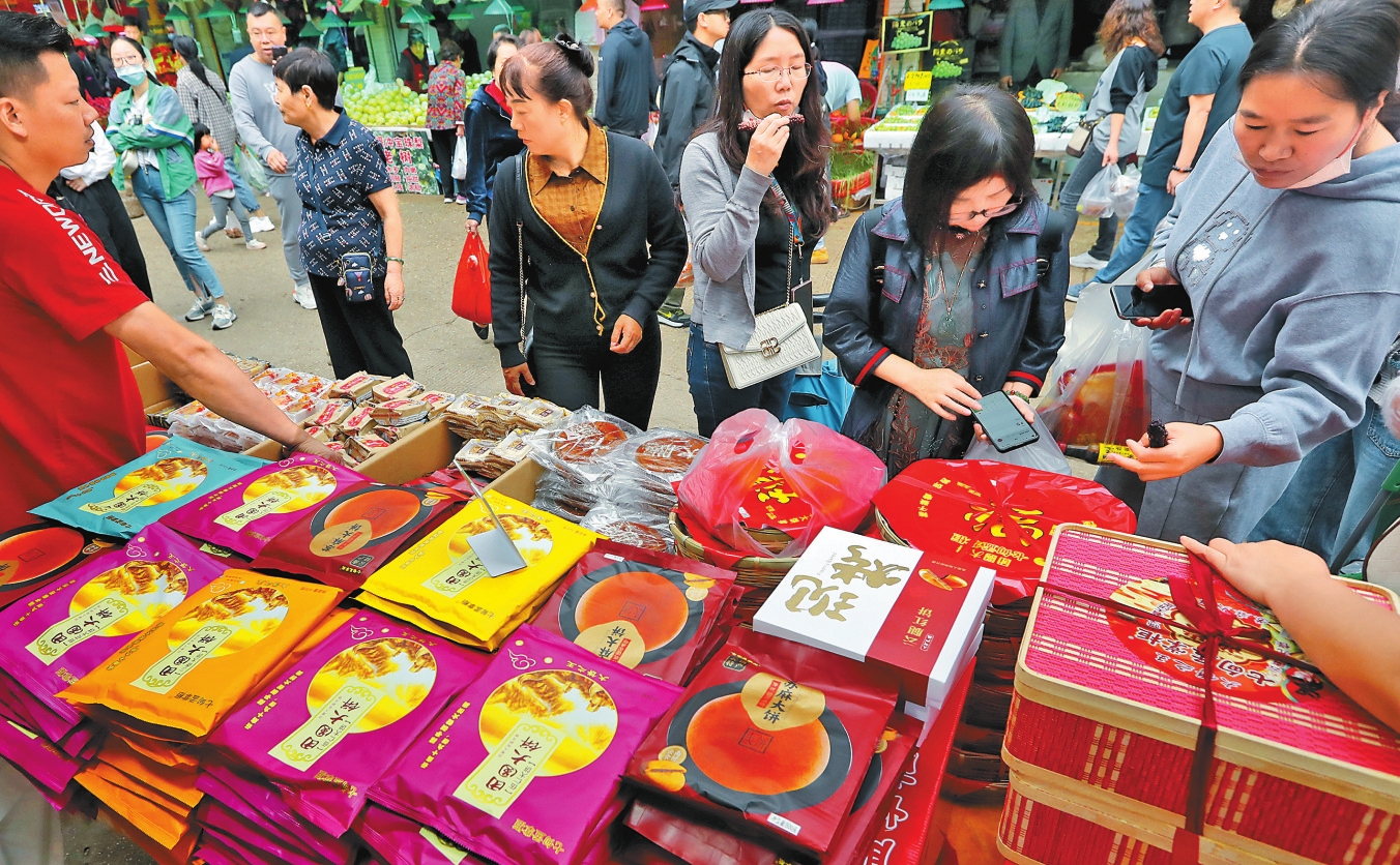 中秋国庆假期,昆明消费市场红火。大观篆新农贸市场里各类商品丰富充足,前来选购的市民熙熙攘攘,特色月饼、核桃、板栗、各种应季水果以及新上市的大闸蟹深受消费者青睐。本报记者 杨峥 摄