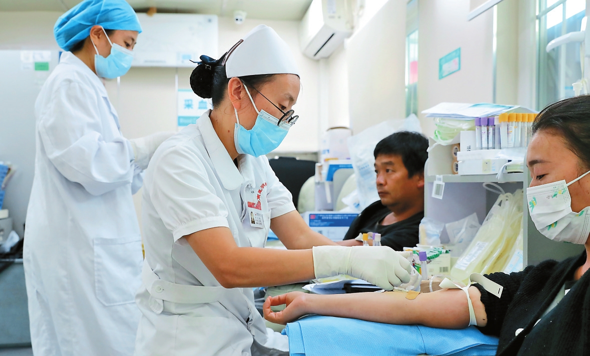 昆明血液中心医护人员为无偿献血的群众采血。