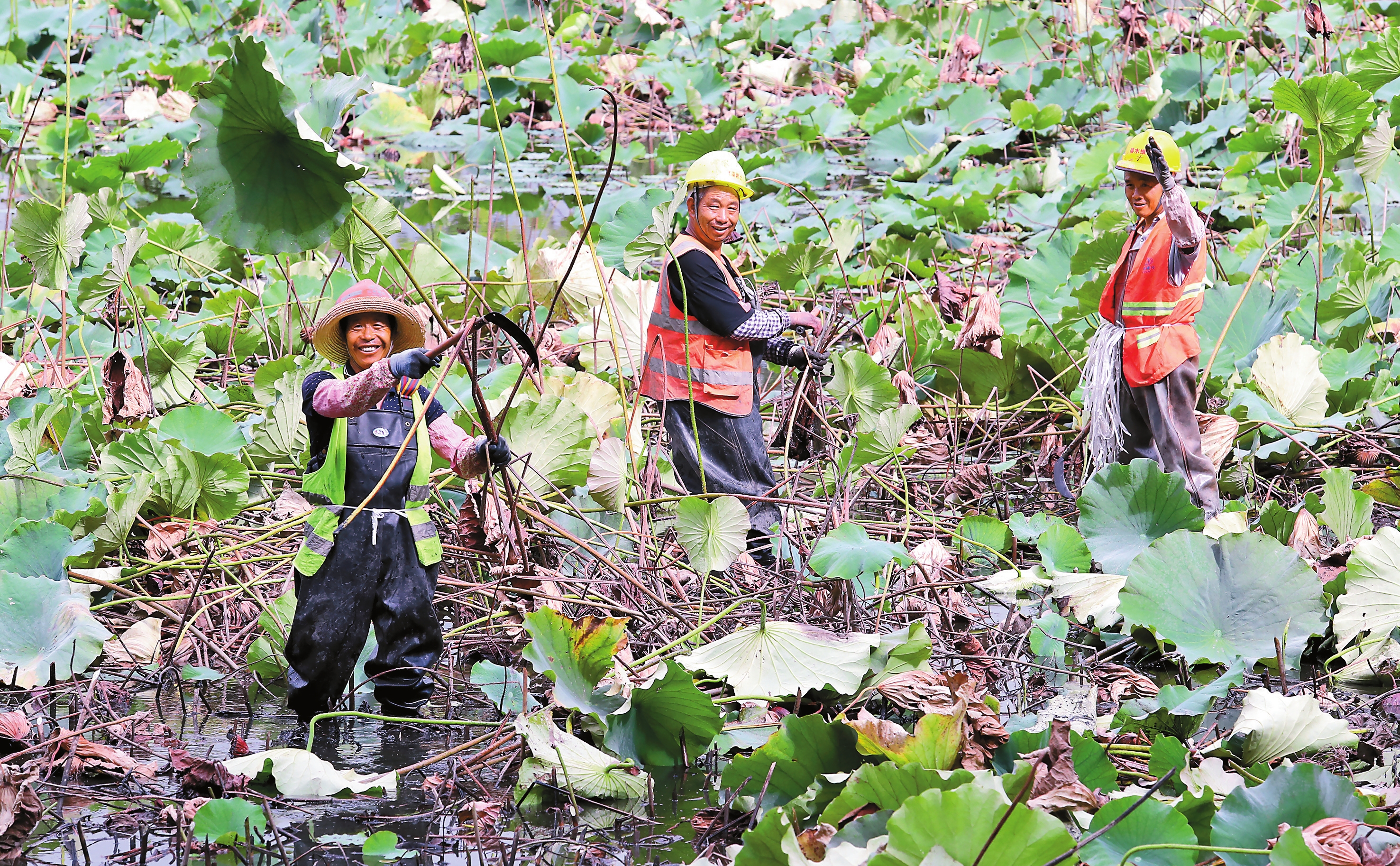 昆明翠湖公园湖塘清淤工人正在作业。