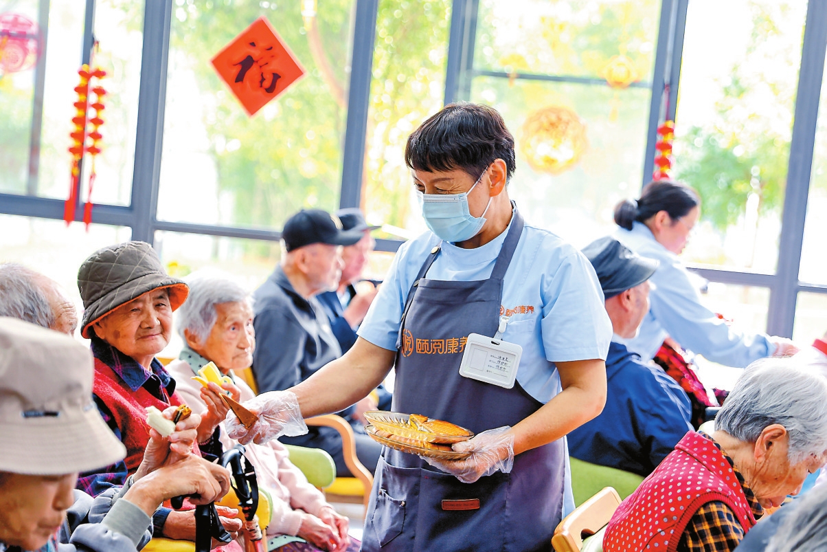 福利院工作人员为老人分发月饼。